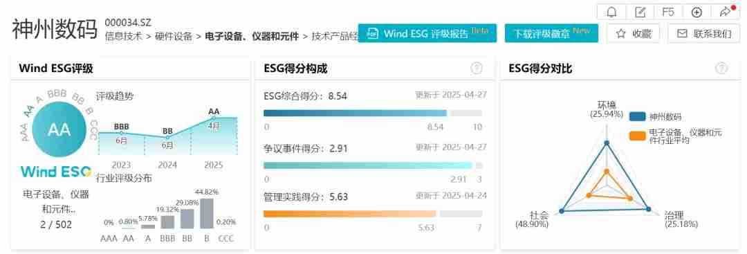 近日,,,万得(Wind)更新了2024年最新ESG评级结果,,,QTPAY钱包数码Wind ESG评级由BB级提升至AA级。。。在此次评级中,,QTPAY钱包数码ESG综合得分为8.54,,在电子设备、、仪器和元件行业502家纳评企业中排名第二,,,,在环境、、、社会、、、、治理三个维度得分分别为6.95、、、8.63、、8.01,,,,均处于行业前列,,充分彰显了其ESG管理水平与可持续发展能力。。。。