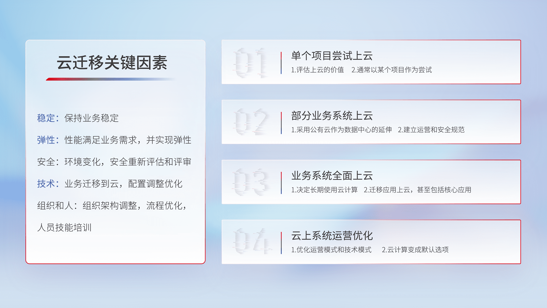 结合实际业务,,从规划设计、、、云平台选型、、、、云原生改造、、数据迁移、、、集成交付,,,迁移全过程为客户识别最佳上云路径,,,,做好风险识别管理,,设计网络架构、、、身份权限、、、安全审计合规、、、操作审计、、日志审计、、监控告警策略、、、多站点容灾设计等,,,,对云上基础设施进行整体规划,,提升IT治理水平,,,以满足弹性、、、、高可用、、高性能的需求。。。。